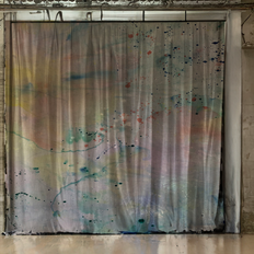 N.Lichtig, EVENT HORIZON (large scale, unstretched, 2024/25) + DARK MATTER (small formats, stretched), two-sided, ink, charcoal, print on fabric, variable sizes, 2016/19.